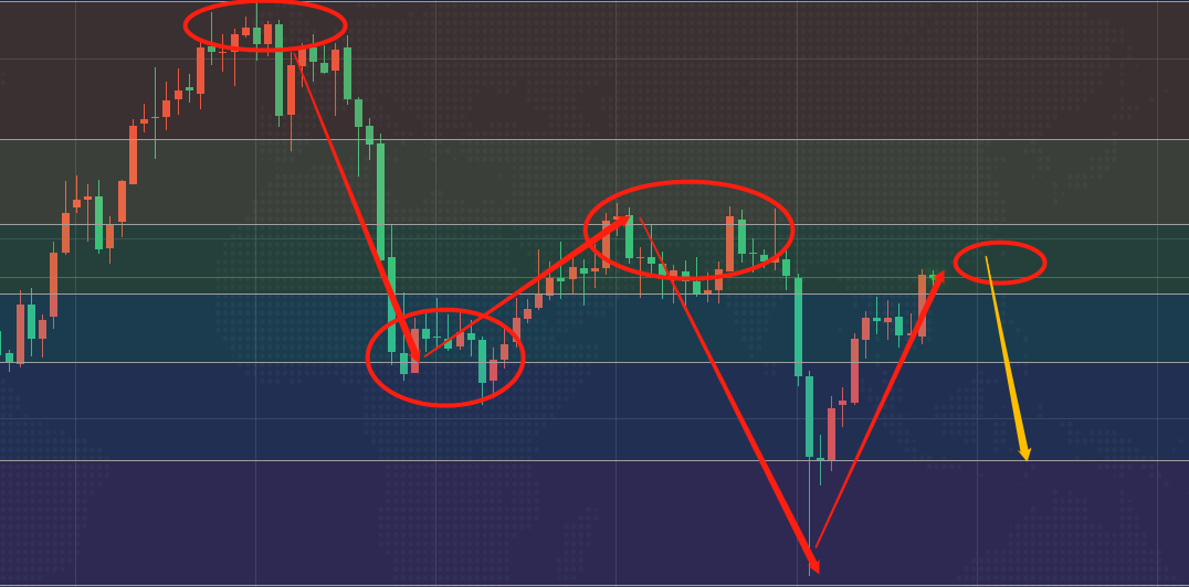 首先,给大家梳理一下近期的黄金整体运行格局,从日线级别上我们很明确的看到当前形态构筑的是一个下行格局,也就是黄金中期的趋势仍然属于跌势,不要因为它短周期的反弹就认为它的趋势发生了改变,事实上远远没有,因为黄金在1916区域形成顶部信号后就开始一路的下跌,随后进行了一波反弹,在1830区域又构筑了一个阶段性顶部之后继续深跌,顶部高点下移,走势上很明显是阶梯式下跌格局,这一点我们一定要明白。