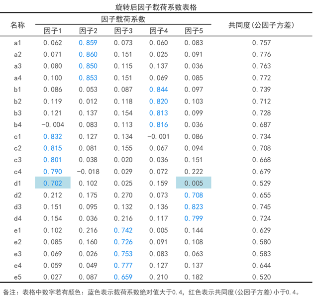 比如上表中的分析项d1,预期归属于因子5里,但实际在因子1里。此时就应该移出d1重新分析。
