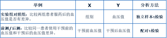 如果想要分析同一组患者用药前后的血压值差异,那么这样的数据属于配对数据,X、Y分别是服药前的血压值和服药后的血压值,此时可使用配对t检验等方法。