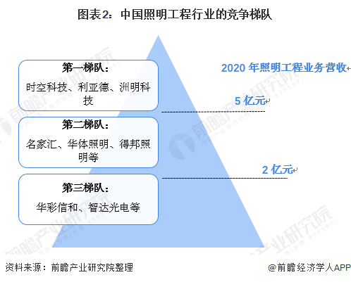 我国国内照明工程行业竞争可分为三大梯队,第一梯队为照明工程业务营收在5亿元以上的企业,代表性企业有时空科技、利亚德、洲明科技;第二梯队为照明工程业务营收在2-5亿,代表性企业有名家汇、华体照明、得邦照明;第三梯队为照明工程业务营收在2亿以下,代表性企业有华彩信和、智达光电。