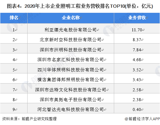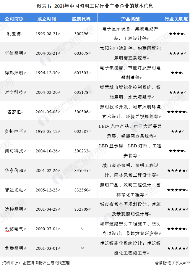 目前,在我国包含照明工程相关业务的上市公司包括:利亚德(300296)、华体照明(603679)、得邦照明(603303)、时空科技(605178)、名家汇(300506)、奥拓电子(002587)、洲明科技(300232)、华彩信和(835035)、智达光电(832360)、达特照明(832709)以及非上市企业:凯铭电气、龙腾照明。
