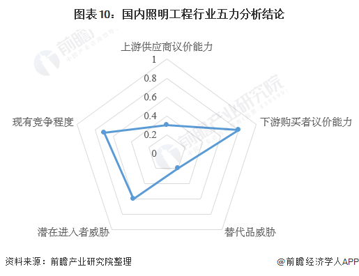 根据以上分析,对各方面的竞争情况进行量化,1代表最大,0代表最小,国内照明工程行业的竞争情况如下图所示: