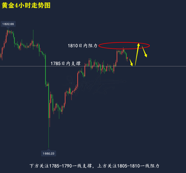 黄金技术面来分析,日线上,隔日黄金早盘下跌后回落后回升上涨,刷新日内高位后再次回落,录得带上下影线的小阴,日线上,今日行情延续隔日尾盘下跌,预计有测试MA10日均线支撑的可能性;4小时上,隔日黄金短暂持于高位横盘刷新高后展开回落,并跌破中轨位置,当前布林带处于开口期,MA均线走出死叉,KDJ随机指标三线向下,到达超卖,MACD指标绿色动能柱持续放量,快慢线死叉向下,综合来看,黄金目前短期仍有下行可能性,预计会跌至日内支撑附近上涨,日内操作建议高空低多进行操作,下方关注1785-1790一线支撑,上方关注1805-1810一线阻力。