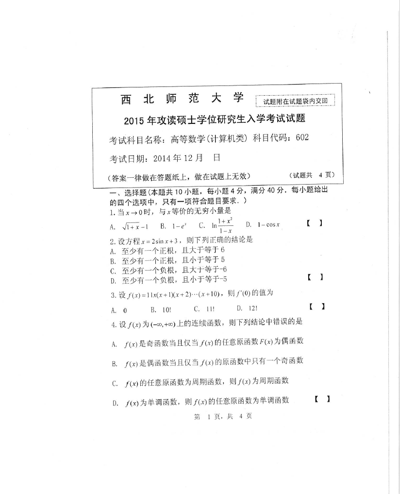 602高等数学[计算机类](西北师范大学2015年攻读硕士学位研究生入学考试试题).pdf