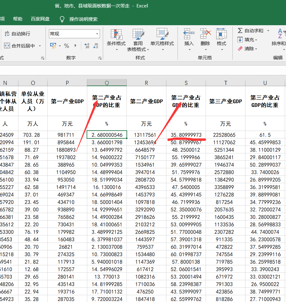 首先,对于变量名称的错误非常抱歉,对您造成不便了。或许是您没有购买我的数据,只是从图片看到部分截图,但是购买数据的人应该一眼就能看出这代表的是第一产业占比,因为后面紧接着就是第二产业产值和占比,所以非常抱歉啦~~~~~我不知道大量错误指的是什么?还望告知。我应您要求打开数据检查,确实,在“第一产业GDP”后出现了“第二产业占比”这个指标,这只是个变量名称输入错误吧,何来大量错误之说?只需稍稍往后就可以看到您说第二产业占比--35.8~~~