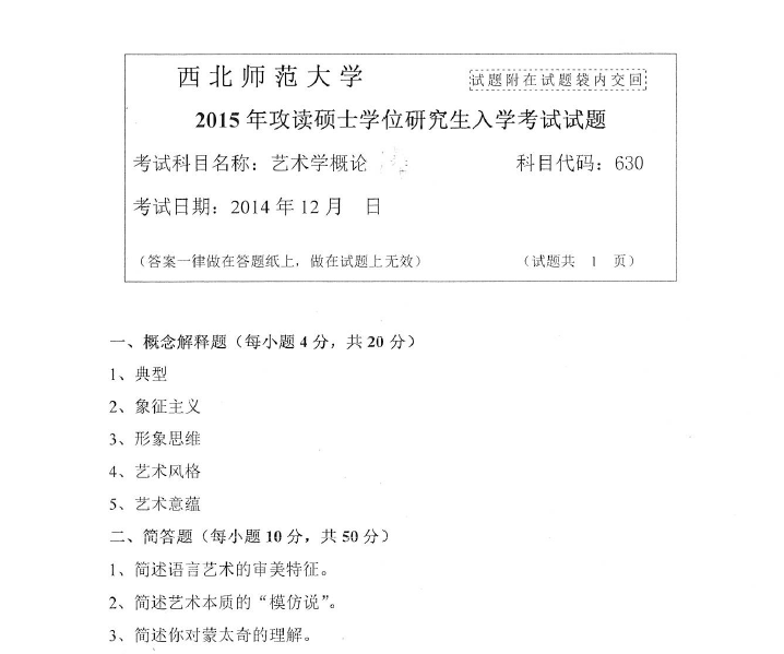 630艺术学概论(西北师范大学2015年攻读硕士学位研究生入学考试试题).pdf