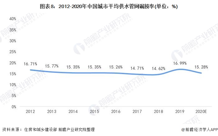 我国供水管网漏损率较高,主要原因为我国水生产公司一般采取垄断经营或者一体化经营,整体运行效率较为低下;同时,水生产行业设备陈旧以及二次供水设备产权模糊造成了大量的泡水、漏水。2012-2019年,我国城市供水管网漏损率保持在14%以上,2019年为16.99%。为降低供水管网漏损率,水务部门需要通过智慧水务检测和管理供水设备和管网,加强管网维护和管理。