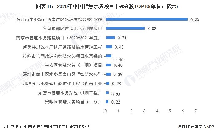 从图表数据可以看出,排在中标金额第一位的为宿迁市中心城市西南片区水环境综合整治PPP项目,中标金额为6.35亿元,第二位为蔡甸东部区域清水入江PPP项目,中标金额为3.02亿元,可见PPP项目金额较高。