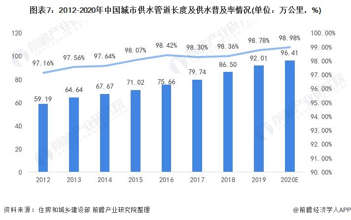 2019年我国城市供水管道长度达92.01万公里,供水普及率达98.78%,2020年,我国城市供水管道长度约为96.41万公里,供水普及率约为98.96%。2019年,全国城市排水管道增加至74.40万公里,同比增速为8.85%。2009-2019年我国城市排水管道长度平均增速为8.04%, 2020年我国城市排水管道长度约为80.38万公里。