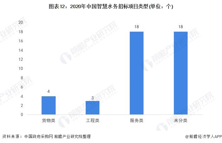 从项目类型来看,我国智慧水务项目采购内容包括货物类、工程类和服务类。2020年,我国智慧水务招标项目中货物类项目4个,工程类项目3个,服务类项18个,未分类项目18个。