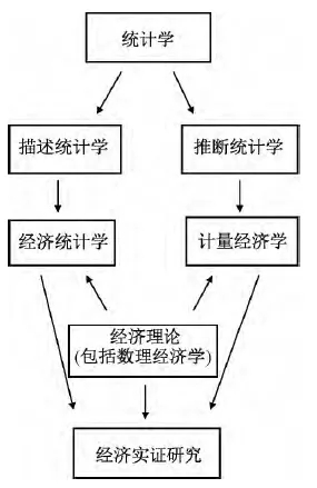 图一:统计学、经济统计学、计量经济学、经济理论与经济实证研究之间关系图解。