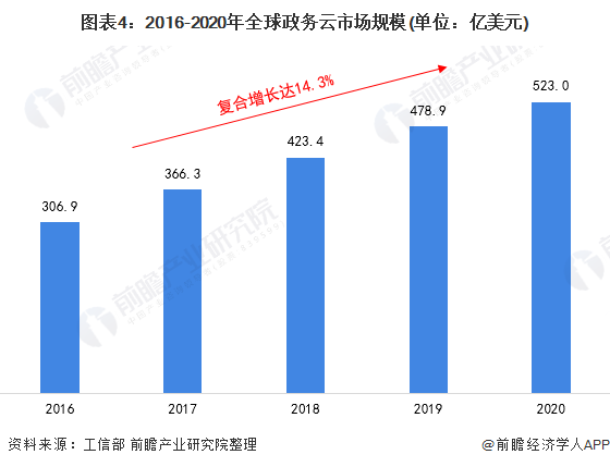 根据工信部研究数据显示,2016-2020年,全球政务云市场稳步增长,2020年全球政务云市场规模为523.0亿美元,同比增长9.2%,近四年全球政务云市场规模复合增长率达到14.3%。