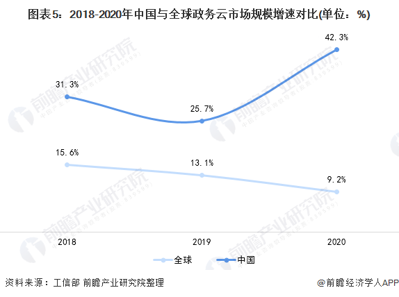 从政务云市场增速来看,近三年全球政务云市场规模增速均在20%以下,其中2020年规模增速下降至9.2%。反观中国,近三年中国政务云市场规模增速均保持在20%以上,2020年更是达到惊人的42.3%,实现政务云市场加速增长。相对于全球,中国政务云正在高速发展。