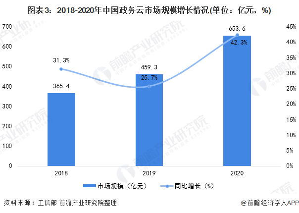我国政务云的发展经历了多年的培育和探索阶段,已经进入全面应用的普及阶段。在2020年新冠肺炎疫情的影响下,中国加快推进政务云建设。据工信部研究数据显示,2020年我国政务云市场规模达到653.6亿元,同比增长42.3%。