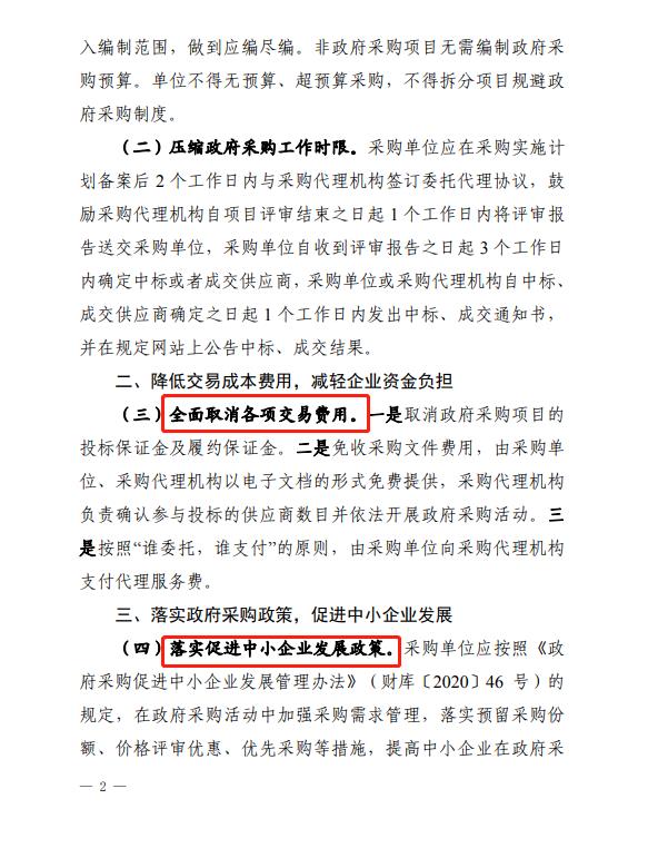 《通知》中规定,全面取消各项交易费用,即取消政府采购项目的投标保证金及履约保证金,免收采购文件费用,此外,按照“谁委托,谁支付”的原则,由采购单位向采购代理机构支付代理服务费。