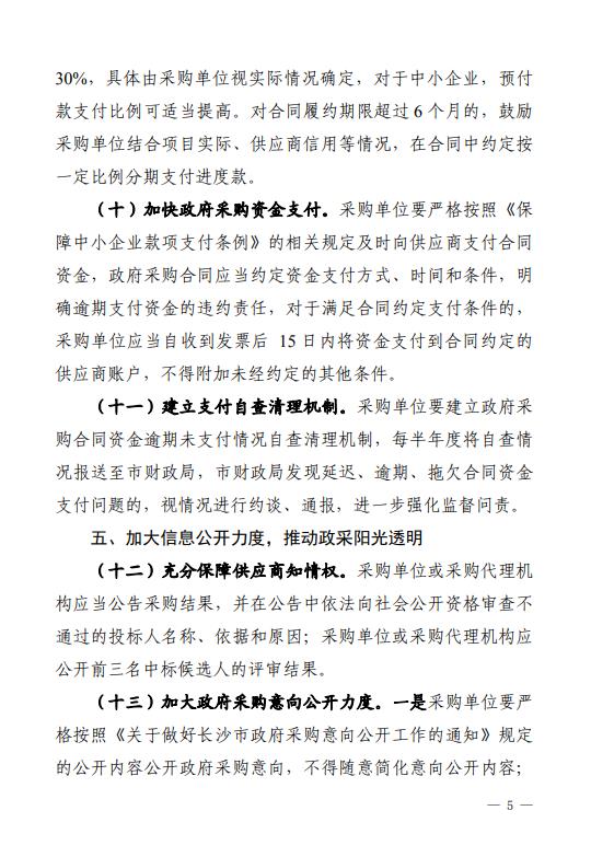 此外,《通知》中要求,建立政府采购预付款制度。鼓励采购单位结合项目实际、供应商信用等情况,在采购文件及合同中明确约定支付一定比例的预付款,预付款支付比例原则上不低于合同金额的 30%,具体由采购单位视实际情况确定,对于中小企业,预付款支付比例可适当提高。