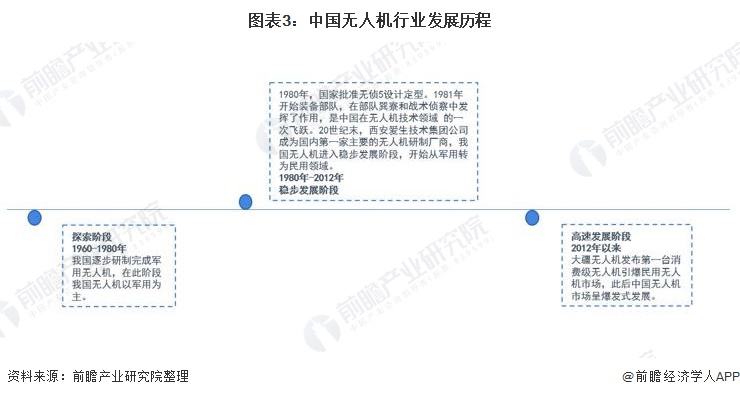 20世纪末,西安爱生技术集团公司成为国内第一家主要的无人机研制厂商,我国无人机进入稳步发展阶段,并逐步从军用转为民用领域。2012年,大疆无人机发布第一台消费级无人机引爆民用无人机市场,此后中国民用无人机市场呈爆发式发展。