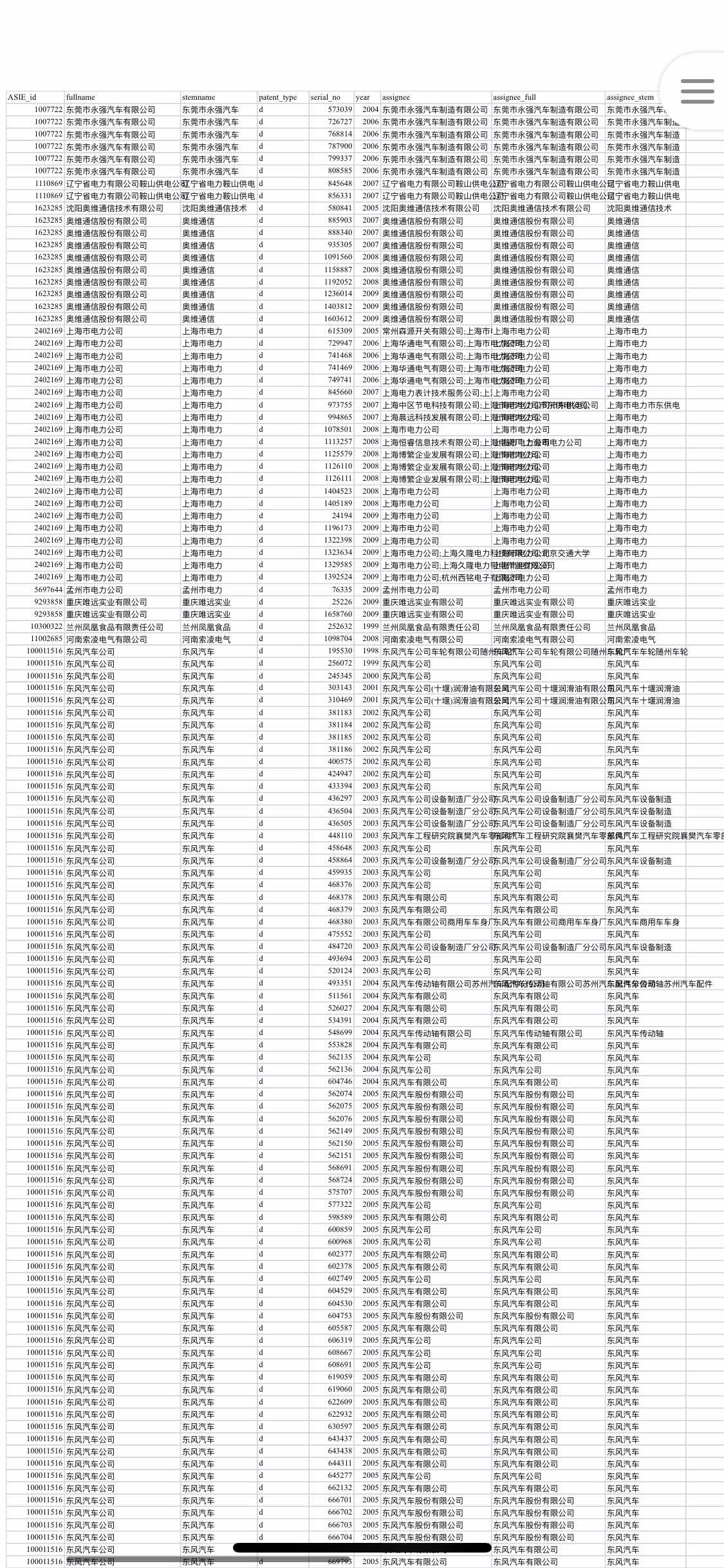 专利数据库的原始数据包括工矿企业、科研机构、个人、大专院校等主体的全部专利申请和授权信息,该数据库的原始数据非常宝贵,可应用范围非常广泛。时间跨度公开(公告)日、申请日、主分类号、分类号、分案原申请号、优先权、申请(专利权)人、地址、专利代理机构、代理人、页数、国省代码、申请号、公开