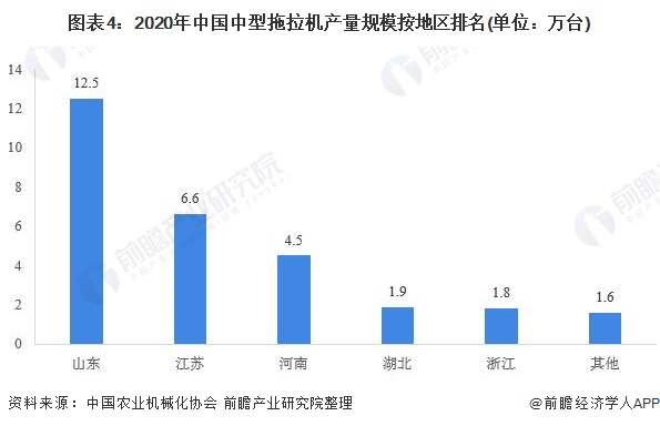 在大中型拖拉机方面,由于大中型拖拉机产量是一个复杂的非线性系统,因此生产难度较小型拖拉机有所提升。具体到中型拖拉机领域,2020年中型拖拉机产量最高地区为山东12.5万台,占总中型拖拉机产量的43.3%。