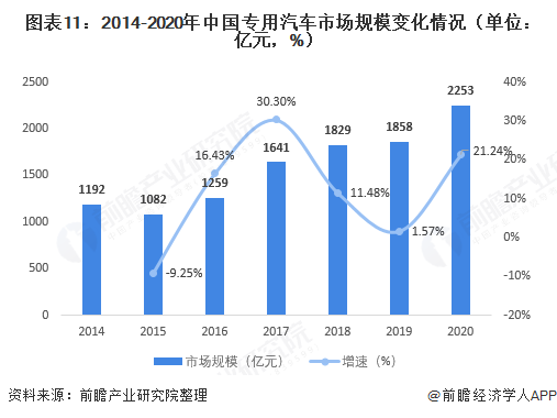 2014-2020年专用车的市场规模呈现波动上升的态势。2020年专用车市场规模达到2253亿元,同比增长21.24%,这主要是由于疫情中用于运输新冠疫苗的物流车需求量大涨所致。随着疫情逐渐稳定,专用车的市场需求将会回归正常水平,继续稳步增长。