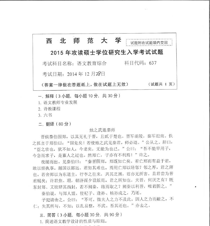 637语文教育综合(西北师范大学2015年攻读硕士学位研究生入学考试试题).pdf