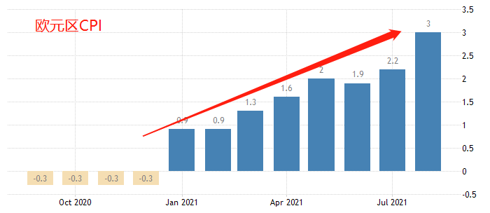 2020年末,CPI为-0.3%,就是通货紧缩状态。在这之后,经过8个月的连翻上涨,欧元区CPI奇迹般地达到了3%的超预期水平。按照当前的通货膨胀率,不单单欧央行每月的购债计划需要削减,甚至基准利率都要快速提高。然而,有一个问题需要解决,那就是这样的高通胀是暂时性的还是持久性的。