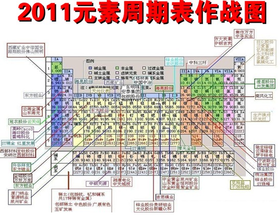 当前市场资金对资源股青睐有加,各大资源股均大幅拉升,结合当前局势,通过对个股深度分析,将上市公司与元素周期表相结合,列出周期表中各元素所涉及的公司个股,继而形成2011年元素周期表作战策略图。