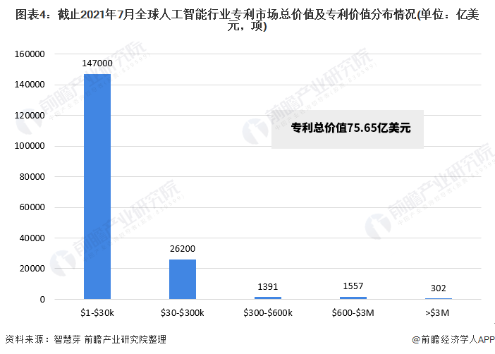 目前,全球人工智能行业专利总价值为75.65亿美元。其中,3万美元以下的人工智能专利申请数量最多,为17.79万项;其次是3万-30万美元的人工智能专利,合计专利申请量为9.81万项。3百万美元的人工智能专利申请数量最少,为1533项。