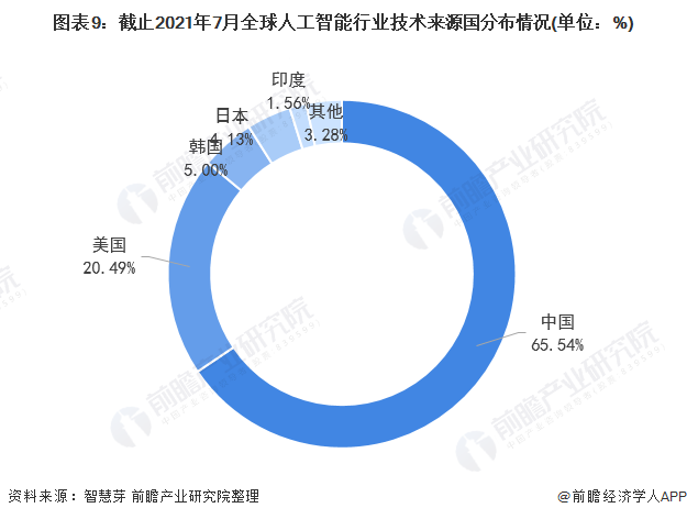 目前,全球人工智能第一大技术来源国为中国,美国人工智能专利申请量占全球人工智能专利总申请量的66.54%;其次是美国,美国人工智能专利申请量占全球人工智能专利总申请量的20.49%。韩国和日本虽然排名第三和第四,但是与排名第一的中国专利申请量差距较大。