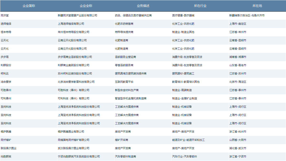 | 企业简称 | 企业全称 | 业务描述 | 所在行业 | 所在地 | 企业简介 | 详细地址 | 联系电话 | 企业网址 | 邮箱 | 成立时间 | 统一信用代码 | 法人代表 | 注册资本 | 经营状态 | 经营范围 | 注册地址 | 上市状态 | 股票代码 | 交易所 | 交易轮次 | 融资或募集金额 | 单位 | 交易股权 | 投后估值 | 单位 | 融资或上市时间 | 交易或发行状态 | 交易类型 | 交易方式 | 支付方式 | 是否关联交易 | 重大资产重组 | 交易或发行价格 | 单位 | 本次交易或发行股份数量 | 上市首日收盘价 | 单位 | 上市类型 | 发行费用总计 | 单位 | 投资方名称 | 投资方基金名称 | 投资机构类型 | 投资金额 | 单位 | 本次交易股权比例 | 投资方 投资地位 | 投资方上市状态 | 投资方股票代码 | 投资方交易所 | 退出方名称 | 退出方基金名称 | 退出机构类型 | 退出方式 | 退出方上市状态 | 退出方股票代码 | 退出方交易所 | 中介名称 | 中介类型 |