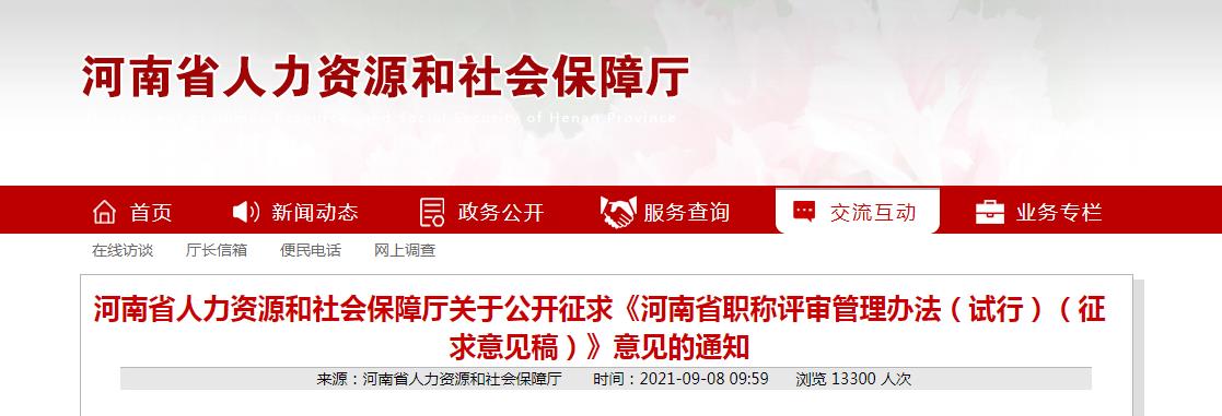 近日,河南省人力资源和社会保障厅起草了《河南省职称评审管理办法(试行)(征求意见稿)》(下面简称《征求意见稿》),向社会公众公开征求意见,可通过电子邮件、信函等方式反馈意见,意见反馈时间截止9月30日前。