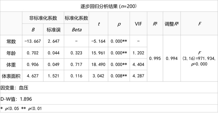 根据回归结果显示,最终模型共包含年龄、体重、体表面积共3个自变量。R方值为0.995,意味着年龄,体重,体表面积可以解释血压的99.5%变化原因,说明模型构建较好。
