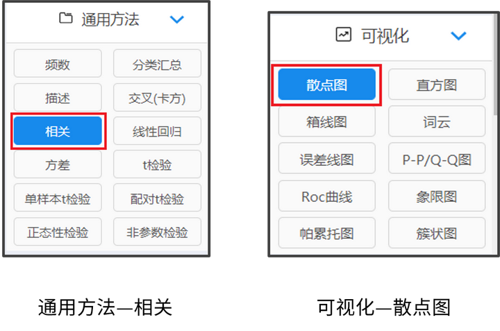 登录SPSSAU,选择【通用方法】–【相关】或【可视化】–【散点图】。