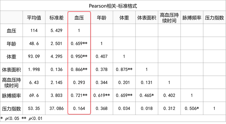 从相关分析结果看,年龄、体重、体表面积、脉搏频率与血压有显著的正相关关系。