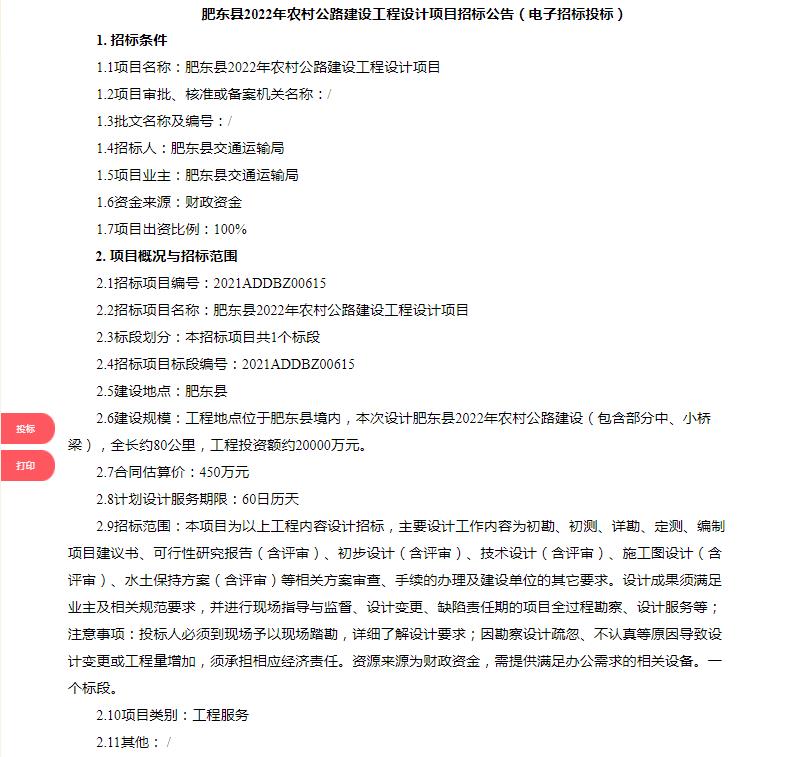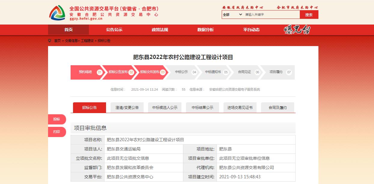 最新招标资讯,今日,安徽合肥公共资源交易中心发《肥东县2022年农村公路建设工程设计项目》招标公告,建设地点肥东县,合同估算价450万元,计划设计服务期限60日历天。