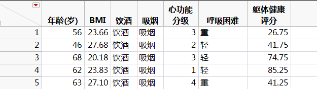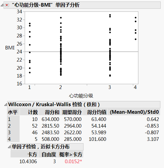 第二部分为统计检验结果,给出了Kruskal-Wallis秩和检验的结果。表明不同心功能分级患者的BMI差异有统计学意义(卡方=10.4306,P=0.0152)。