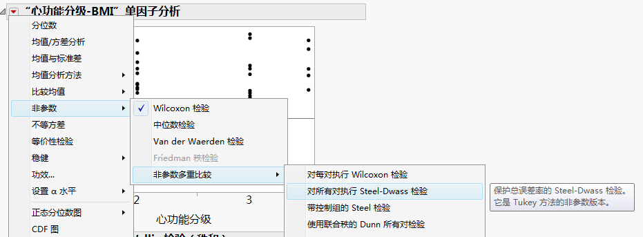 点击“心功能分级-BMI”单因子分析旁边的红色三角形按钮,在下拉菜单中选择“非参数”→“非参数多重比较”→“对所有对执行Steel-Dwass检验”,操作见图7。
