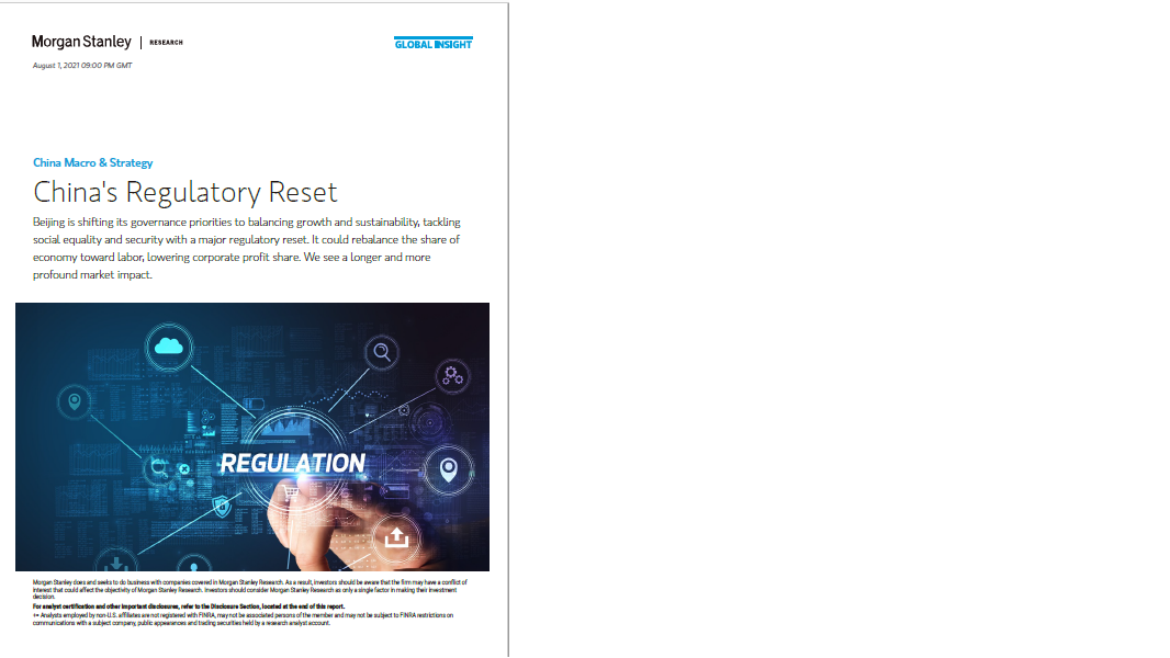 摩根士丹利:我们正站在中国经济和资本市场一个重要的转折点上。新目标带来的经济底层逻辑的重置以对互联网巨头监管为标志,中国正在转换经济发展的底层逻辑:从增速优先转向兼顾公平,对于部分高垄断---进而带来某些行业可能有影响。