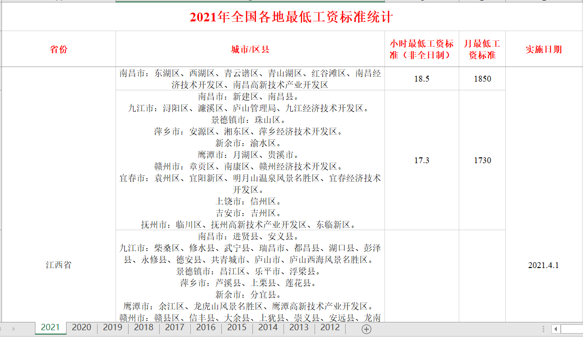 最新2012-2021年中国省级、城市、县区最低工资标准数据