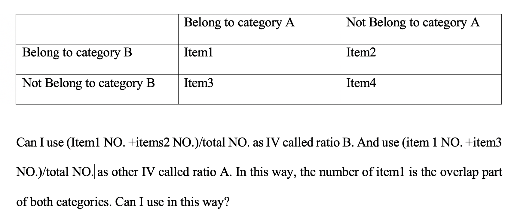 他们item1 的部分是重合的, 我可以这样定我的自变量吗? 两者的correlation =-0.45。