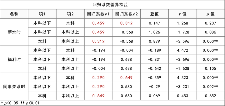 上表格展示‘薪水’,‘福利’和‘同事关系’分别对于工作忠诚度的影响,以及区分不同学历情况下时的回归系数差异情况。表格中红色部分表示在表1回归模型中有显著影响的结果。