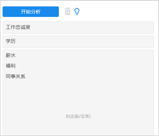 分别将薪水、福利、同事关系三项放入X框;学历放入分组项,工作忠诚度放入Y框。点击开始分析。