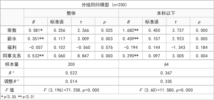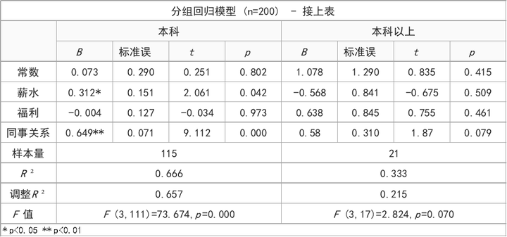 从每个模型的样本量中,也可以看出第一个模型为整体模型(样本量200),另外3个模型样本量总和为200。相当于分别筛选出对应学历的样本进行线性回归分析,其中本科以下样本为64人,本科为115人,本科以上21人。由于分组回归会分散每个回归的有效样本量,建议每个组别样本量较多时使用。