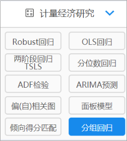 登录SPSSAU,选择【计量经济研究】–【分组回归】。
