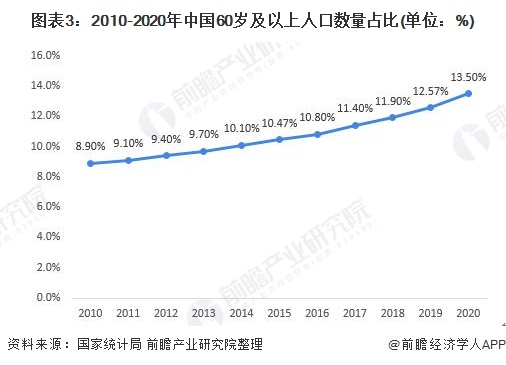 根据国家统计局的数据,近年来我国老龄化人口占比不但上升,65岁以上的老龄化人口比例从2010年的8.9%上涨至2020年的13.5%,上涨了4.6个百分点。