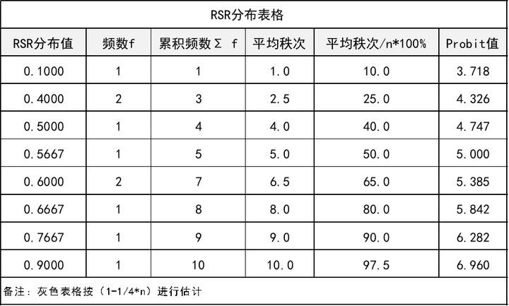 - Step4:确定RSR分布。列出RSR的分布表格情况并且得到Probit值;