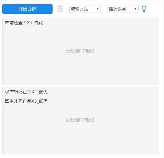 将“产前检验率”放入【高优指标】框,“孕产妇死亡率”、“围生儿死亡率”放入【低优指标】框。点击开始分析。
