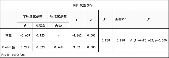 上一步得到Probit值之后,将其作为自变量X,将RSR分布值作为因变量Y;进行回归模型拟合,模型公式为:RSR分布值=-0.609+0.222*Probit值。并结合此回归模型公式得到各个地区RSR值的拟合值,用于最终的分档排序等使用。