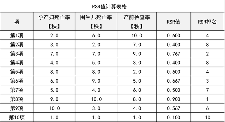 本次利用RSR秩和比法,针对10个地区(即第1项~第10项)医院,共3个指标产前检查率,孕产妇死亡率,围生儿死亡率进行综合评价。其中X1为高优指标,X2和X3均为低优指标。