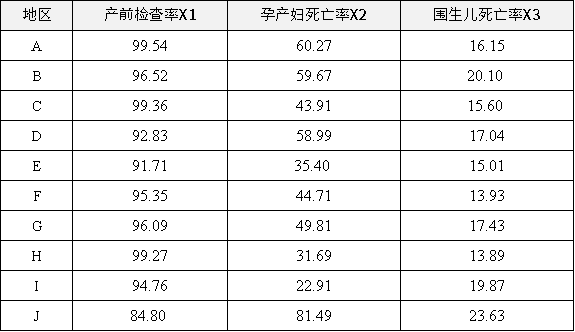 当前有某省某年10个地区孕产妇保健工作的产前检查率X1(%),孕产妇死亡率X2(%),围生儿死亡率X3(%)。